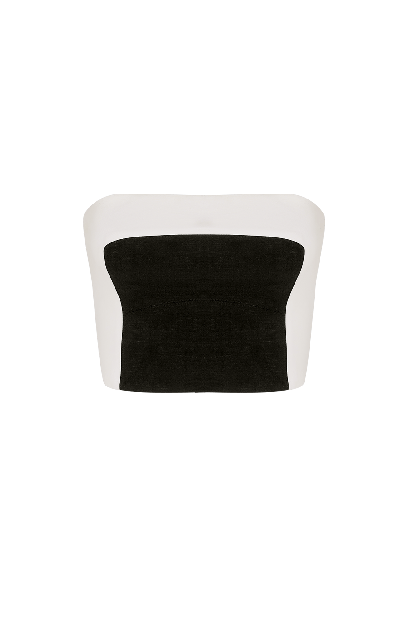 Com silhueta marcada, o top preto Alessia tem recorte geométrico bicolor no centro, que adiciona contraste ao look. Sem alças, a peça tem decote reto e zíper destacável nas costas para ajuste descomplicado.