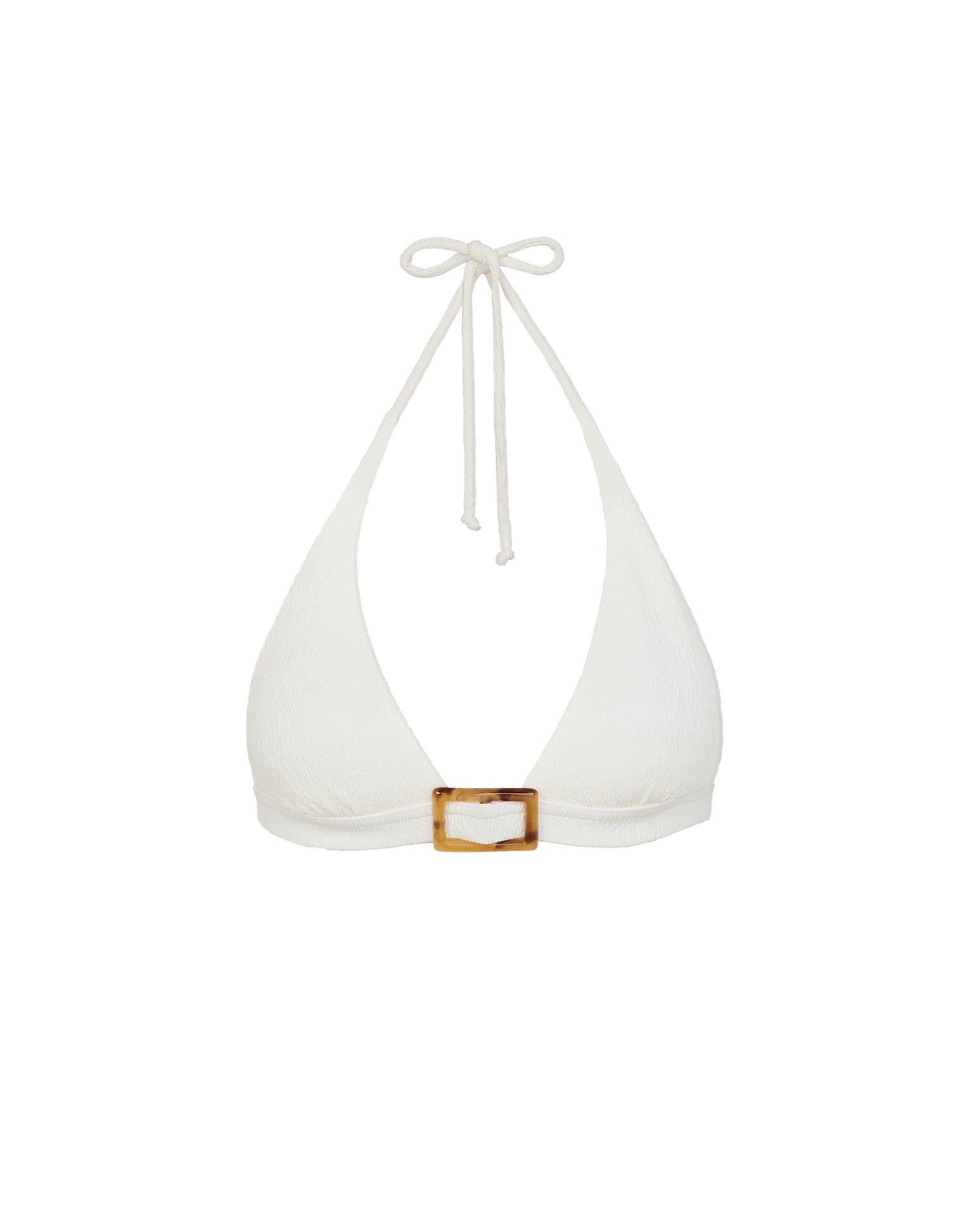 O top de biquini branco tem shape triângulo e possui cós fixo com detalhe de resina estilo fivela, amarração no pescoço e costas inteiras.