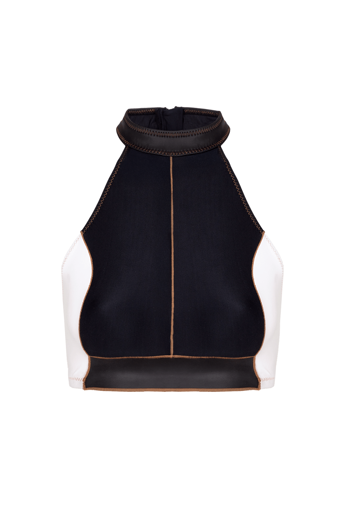 O top Morgan é alongado, com recortes bicolores e acabamento em tecido emborrachado. As costuras em linha contrastante dão um toque especial para a peça, que conta com fecho em zíper nas costas.