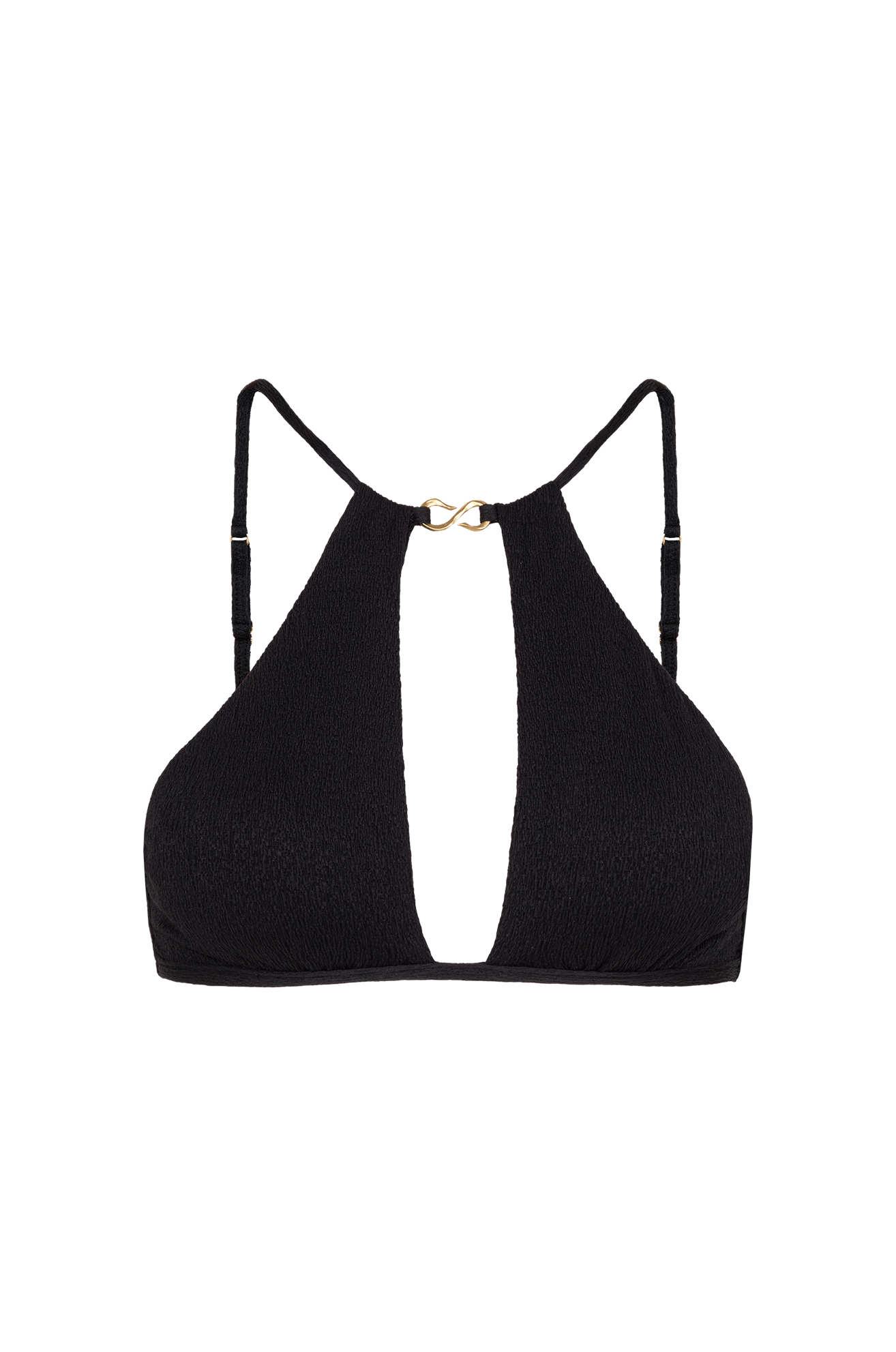 A modelagem do top de biquíni preto tem shape alongado com abertura no centro e alças paralelas reguláveis. Experimente usar também como top em looks além da praia.