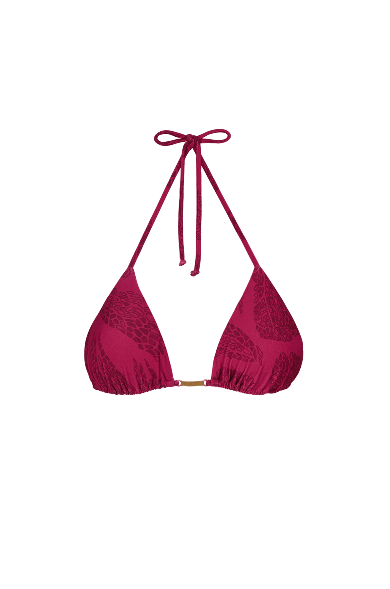 A modelagem Tri tem o top de biquíni estampado em shape triângulo ajustável com amarração nas costas e no pescoço.